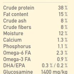Crude Protein 38%, Fat Content 15%, Crude Ash 8%, Crude Fiber 6%, Moisture 12%, Calcium 1.3%, Phosphorus 1.1%, Omega-3 Fatty Acids 0.9%, Omega-6 Fatty Acids 2.3%, DHA (Docosahexaenoic Acid) 0.3%, EPA (Eicosapentaenoic Acid) 0.2%