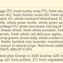 Fresh chicken (18%), raw turkey (10%), fresh chicken giblets (liver, heart) (10%), raw whole herring (6%), raw whole hake (5%), fresh eggs (5%), raw turkey liver (5%), dehydrated chicken (5%), dehydrated turkey (5%), dehydrated mackerel (4%), dehydrated sardine (4%), dehydrated herring (4%), whole red lentils, whole green lentils, whole peas, lentil fibre, whole chickpeas, whole pinto beans, pea starch, pollock oil (2%), chicken fat (2%), whole navy beans, dried kelp, fresh whole pumpkin, fresh whole butternut squash, fresh whole zucchini, fresh whole carrots, fresh whole apples, fresh whole pears, dried chicory root, fresh kale, fresh spinach, fresh beet greens, fresh turnip greens, whole cranberries, whole blueberries, whole saskatoon berries, turmeric, milk thistle, burdock root, lavender, marshmallow root, rosehips.