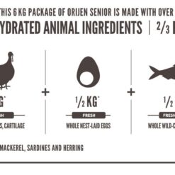 Introducing ORIJEN® Senior Dry Dog Food, created to help your senior dog thrive with protein-rich recipes for peak nourishment. Understanding that dogs are ancestral carnivores, this Biologically Appropriate diet includes whole animal ingredients. ORIJEN® Senior is specifically crafted to support lean muscle mass and weight maintenance in senior dogs. Using WholePrey animal ingredients like organs and bone, ORIJEN® provides the most nutrient-dense parts of the prey to meet your dog’s nutritional needs. With 85% quality animal ingredients and a freeze-dried liver coating, this diet is unmatched.
